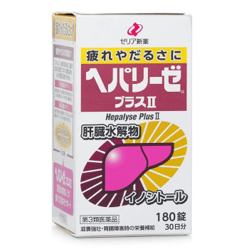 Hepalyse Plus II is a Japanese Class 3 OTC liver-supporting nutritional tonic in tablet form. It combines liver hydrolysate from high-quality natural liver with inositol, vitamin B2 and vitamin E to support recovery from tiredness, help with poor appetite and digestive discomfort, and provide extra nutrition during periods of physical strain or illness.